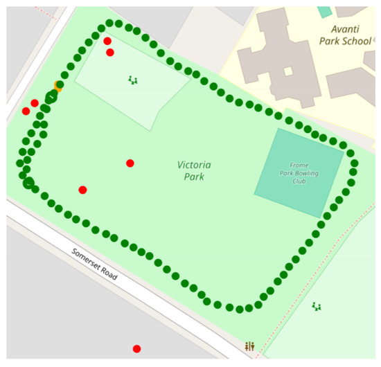 Example of a 6MWT reported on a map. It is visible how some positions are not likely to belong to the actual walked path. In red are samples that are eliminated from the pre-processing filters; in green are samples considered for further analysis.
