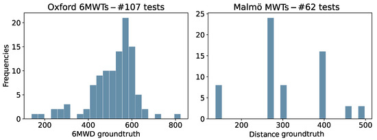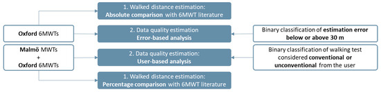 The distribution of ground truth 6MWD of the tests is shown in Figure 5. We can see that the Oxford tests are slightly skewed towards distances above 500 m indicating good walking capabilities. On the other side, the tests performed by healthy researchers are generally shorter in distance. This shorter distance was related to the variable duration of those tests between 3 and 6 min, with a focus on generating controlled differences in walking styles during their traces. For this reason, further analysis will consider results in absolute terms for the Oxford set, which included only 6 min-duration tests, while we will include the results in percentage values for all tests from Oxford and Malmö together to obtain an overall relative result. The usage of the datasets across the walked distance estimation and the data quality assessment of this research is further represented for clarity purposes in Figure 6.