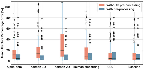 We applied the pre-processing methods reported in Section 3.2 and computed the walked distance using the algorithms described in Section 3.3. Figure 7 shows the mean absolute percentage error for all the traces, with and without the pre-processing steps (filtering and, where applicable, resampling). It is noticeable that the pre-processing positively impacts all algorithms by significantly reducing the percentage error except for the QSS algorithm, which already incorporates filtering rules in its original design [18]. This indirectly illustrates that the built-in filtering mechanism is effective and its application is relevant.