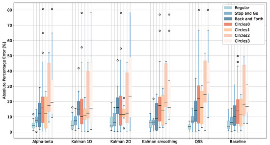 To understand how the shape of the path affects results, Figure 8 reports the absolute percentage error for the tests conducted by healthy volunteers at Malmö with different types of paths considering pre-processed data. The path types “regular” and “stop and go”, which, for the purpose of our analysis, are considered as conventional tests, obtain the lowest median error values, while the recordings including u-turns and circular paths obtain higher median errors. All the algorithms have comparable performances for the same recording type.
