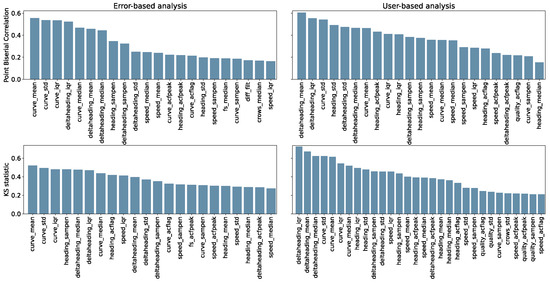 We computed multiple correlation coefficients to validate and identify the association between features and targets for the two considered analyses. The point-biserial correlation [39] and Kolmogorov–Smirnov (KS) statistic were computed in relation to the following binary targets: low error (error < 30 m) and high error (error > 30 m) for the error-based analysis considering only Oxford data, while conventional versus unconventional tests for the user-based analysis considering all available data. The choice of the 30 m threshold is motivated by the Minimal Detectable Change (MDC) of the 6MWD. Among the most conservative values, Chan et al., and Ries et al. [40,41] report a MDC of 28.1 m and 33.5 m, respectively. Given this, we assumed 30 m to be a reasonable choice. Because the MDC can vary across different populations, it is worth mentioning that other studies report higher values of MDC, within 54 m–80 m [42].