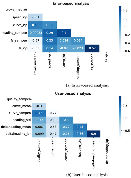 Correlation coefficients between features and target of the error-based and user-based analyses. The features are reported if the correlation coefficient is higher than 0.2 and p < 0.05.
