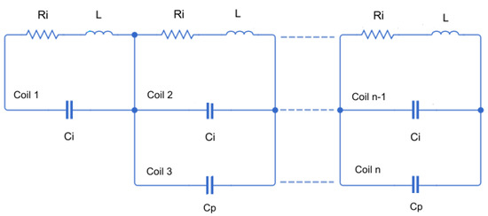 The last step consists of obtaining the total capacitance C of a sensor with n turns, which can be obtained from the solution of the equivalent circuit shown in Figure 3, and is expressed as follows: