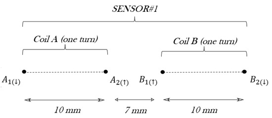 The inductive sensor presented in [38] was designed with a series of four rectangular coils with three turns each; in Figure 1, one of the coils is represented. The sensor was printed on top and bottom faces of a circuit board that was placed along the main wire at both sides.
