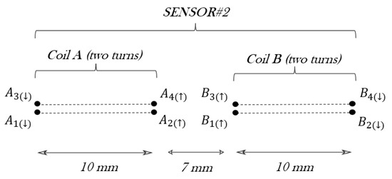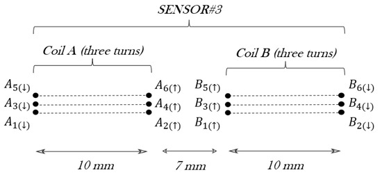 The sensor#3 geometry is made up of two rectangular coils, of three turns each. Again, the total inductance of the sensor depends on the self-inductance of one rectangular coil, e.g., coil A, with three turns and the mutual inductance between coil A and coil B coils , following the expression: = 2 + .
