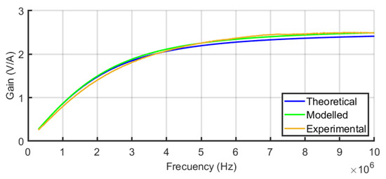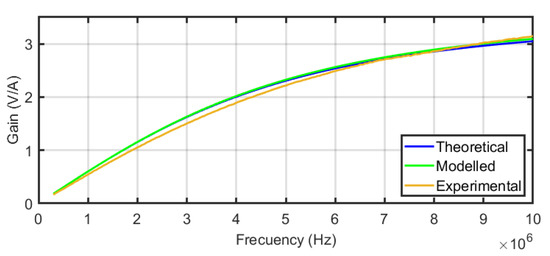 The resulting experimental transimpedances versus frequency for the sensors are compared with their theoretical and their FEM modelled frequency responses in Figure 12 for one turn, Figure 13 for two turns, and Figure 14 for three turns. In order to quantify the deviation of the experimental results with the theoretical and modelled responses, the mean squared error has been calculated for each figure. The square root of the mean squared errors has been obtained to represent the deviation in volts per ampere. The results are collected in Table 3, which reveals the good coincidence between the theoretical approach with the experimental measurements (upper row of the table) and between the FEM model with the experimental measurements (bottom row of the table), both for the three sensors.