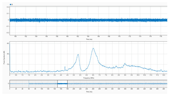 Capture of an experimental measurement with sensor#2 previous to arcing in the monitored circuit. (Upper plot) time-domain signal from the selected time range; (middle plot) average power spectrum from the selected time range; (lower plot) selected time domain range from the overall signal.
