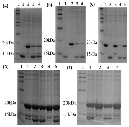 SDS-PAGE gels show the activity of the tested clones prepared from (A) Mut0—L ladder, 1 positive control, 2 negative control, 3,4 selected clones, (B) Mut1—L ladder, 1 positive control, 2 negative control, 3,4 selected clones, (C) Mut2—L—ladder, 1 negative control, 2 positive control. 3–5 selected clones, (D) Mut3—L ladder, 1 negative control, 2 positive control, 3–5 selected clones, (E) Mut4—L ladder, 1 positive control, 2 negative control, 3–4 selected clones. Substrate for cleavage was Trx-DCD1, which had a DDDDK amino acid residue sequence between thioredoxin and dermcidin. Protein ladder was Novex™ Sharp Pre-Stained Protein Standard (Invitrogen, Thermo Fisher Scientific, Waltham, MA, USA).