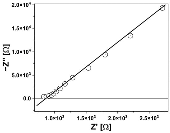 Nyquist diagram expressing the dependence of the imaginary component of the impedance −Z″ from its real component Z′ for Mut 4 with the substrate concentration 0.01 mM. The red line indicates the way of determining the electrolyte resistance parameter for a given enzyme and substrate concentration.
