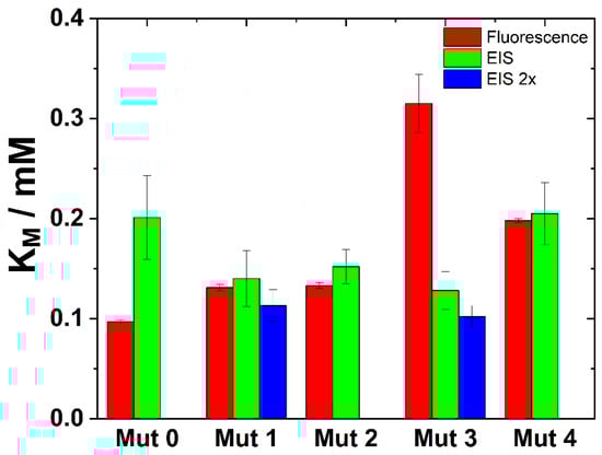 Km values for the enzyme mutations studied and the two methods used to determine their kinetic parameters. EIS 2x denotes doubled enzyme concentrations.