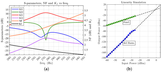 - Nawaz, A.A.; Albrecht, J.D.; Ulusoy, A.Ç. A Ka/V Band-Switchable LNA with 2.8/3.4 dB Noise Figure. IEEE Microw. Wirel. Compon. Lett. 2019, 29, 662–664. [Google Scholar] [CrossRef]