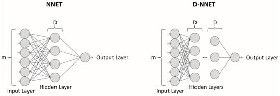 in which there are two critical hyperparameters that need to be chosen, the embedding dimension, m, which captures the autocorrelation structure of the time series, and the number of hidden units, D [35,41,43]. For an artificial neural network model with a deep architecture (D-NNET), the number of hidden layers also needs to be determined [38,45].