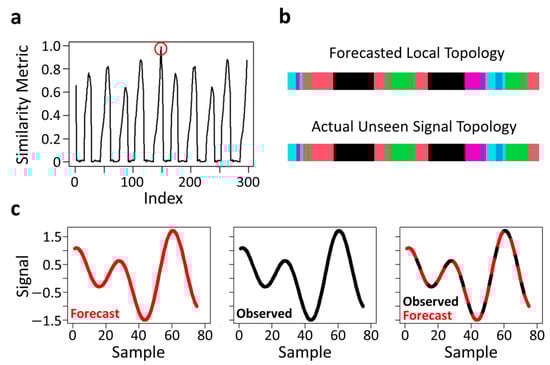 From , element-wise differences in all prior row vectors are computed with respect to the last row vector (an index of the system’s current state), generating a 1 (true) if their difference equals zero, otherwise 0 (false). These binary elements are summed and divided by the length of the row vector. This generates a similarity metric (Figure 3a) that ranges from 0 to 1 that can be used to find the index (+3 to account for the padded local topological matrix and beginning one step in the future) of the encoded training data topological archetype(s). This similarity metric differentially weights the importance of each part of the input training data. This produces a one-dimensional weight vector with respect to the system’s current state. The higher the values, the more closely the topological sequences align with the system’s current state based on topological patterning [38]. These topological archetypes ultimately reveal unique memory traces of past system behaviour(s) that can be used to construct a single multi-step-ahead embodied model of a dynamic system’s upcoming unseen dynamics [38] (Figure 3b,c). This approach has recently shown promise for forecasting human gait kinematics [38].