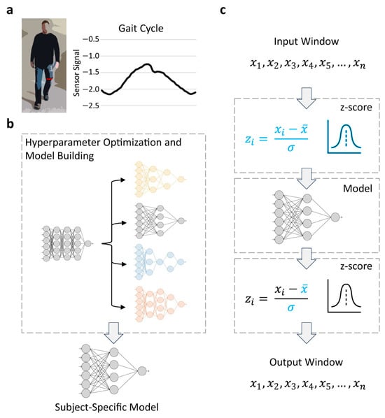 A schematic of the data processing workflow. Gait data were collected by a wearable sensor (illustrated in red in (a), left). The sensor is attached to the leg just above the patellofemoral joint line for recording gait kinematics based on hip flexion/extension using the Ambulosono system ((a), right). A subject’s training dataset was used to estimate hyperparameters and model architectures specific to an individual (subject-specific model) for NNET and D-NNET models (b). This was done on an external computer. For testing on the embedded system, the data for each subject’s input window were first z-score-scaled before being fed into their subject-specific model (c). The forecasted gait data, with the output as a z-score, were then converted back to the original sensor scale based on the attributes (mean and standard deviation) of the z-scored input window data. This allowed comparison to the true sensor signal test data (c).