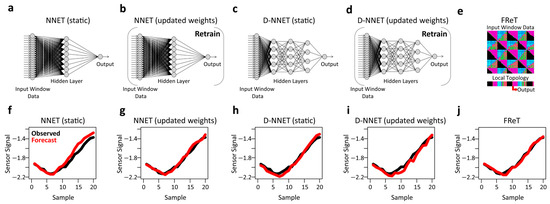 Comparison of models and their outputs. For all NNET and D-NNET models, hyperparameters were determined on an external computing source before being deployed to the Raspberry Pi. NNET and D-NNET models were run under two conditions. The first represents a static model where the model weights are fixed, and each sliding input window was simply fed into the fully pretrained model for predicting the unseen output window data (a,c). For the second condition, the model weights are updated by retaining with the input window data (b,d). Panel e illustrates topological archetype identification based on a simple maximization problem. (f–j) present example forecasted data with an input window of 80 data points and an output (forecast) window of 20 data points for each of the corresponding models shown above (a–e). Ground truth is shown in black, while each model’s predicted trajectory is shown in red.