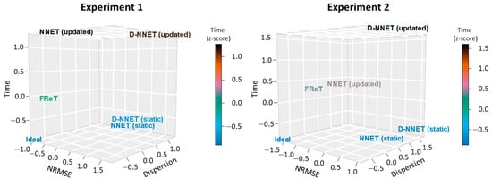 Next, to ensure that FReT’s accuracy was not at the expense of computational cost, the computational time for each model was evaluated and is summarized in Table 2. While the static NNET and D-NNET models offered the best performance in terms of computational time (Table 2), they were not the most accurate (Table 1). The most accurate network model was the updated NNET model (Table 1). However, while the updated NNET model exhibited the best performance of all the artificial neural network models tested in terms of accuracy, FReT had less intra-individual variability, was more accurate, and was faster than the best-performing artificial neural network model (Table 1 and Table 2). Moreover, FReT also provided the best balance with respect to accuracy, intra-individual variability, and computational time when considering the combination of these performance variables. This is easily seen when plotted in scaled multidimensional space (Figure 8). There, it is evident that FReT tends to be located on the left, mid-to-lower side of the plot towards the ideal situation (i.e., the left bottom corner, which represents the idealized condition of a model’s performance variables approaching zero: zero error, zero computational time, and zero dispersion) (Figure 8). In fact, of all the models, FReT was closest to this idealized condition for both experiment 1 and experiment 2 (Figure 8 and Table 3).