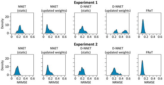 Distribution of NRMSE for FReT and the artificial neural network models. For each experiment, the distribution density of the average NRMSE per participant for all fifteen participants is shown for each model. The updated NNET model was the best-performing network model, while FReT was the best-performing model overall.