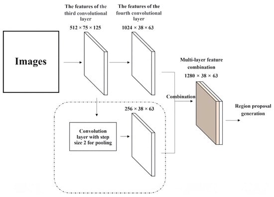 Commonly used backbone networks in the Faster R-CNN model include VGG16 and ResNet. In ResNet, multi-layer feature combination refers to combining the output features from both the third convolutional layer and the fourth convolutional layer together. To make sure that the size of the third convolutional layer’s output matches that of the fourth convolutional layer’s output in dimensionality terms, the output of the third convolution layer is pooled by the pooling layer whose convolution kernel size is 3 × 3 and step size is 2. Then, the third and fourth convolutional layers are combined in the concat layer.