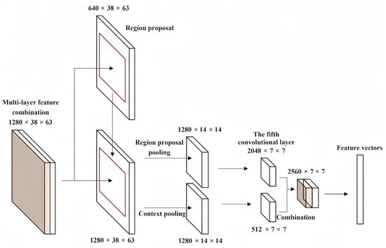 To combine the features in the whole original image with the local features of the region proposals, two different sizes of the features need to be converted into the same size. However, the output features of the last convolutional layer have been changed to 1/16 of the original image after four pooling layers in the model. Therefore, the multi-layer feature combination proposed in Section 3 is firstly context pooled and divided into multiple regions with a size of 14 × 14. The fixed-size features are obtained by maximum pooling in all regions, and then, the size of features is reduced to 7 × 7 using a convolution layer whose step size is 2. Finally, after combining them with the local features of region proposals, the final feature vectors are obtained. The process of combining contextual features is shown in Figure 2.