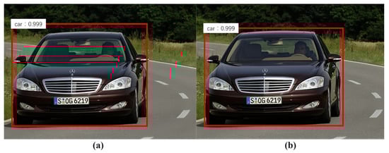 Through the calculation, a new bounding box of the target object is obtained. The vehicle-type recognition results before and after our voting algorithm are shown in Figure 4. Compared with the bounding box without the voting algorithm, the position accuracy of the bounding box has been significantly improved.