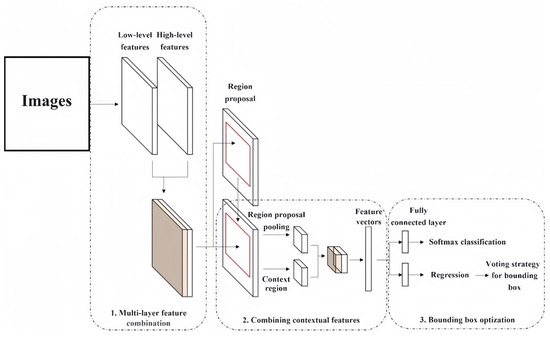Therefore, this paper adopted contextual features in Faster R-CNN to improve the performance of vehicle-type recognition, since the feature extraction of the whole original image is required after the network is improved by the multi-layer feature combination in the previous section. The recognition accuracy of Faster R-CNN can be improved by using the contextual features extracted in the multi-layer feature combination step.