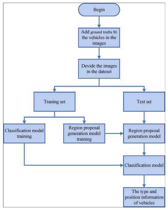 In this paper, the MIT DriveSeg Dataset [28], the Caltech Pedestrian Detection Benchmark [29], and 1000 vehicle images on the internet were used as the dataset, mainly including a total of three types of vehicle samples (including cars, SUVs, and vans). The MIT DriveSeg Dataset and the Caltech Pedestrian Detection Benchmark are often used as the basic dataset for some vehicle recognition methods and have good performance in recognition results. The MIT DriveSeg dataset is a large-scale traffic scene segmentation dataset that annotates road objects at the pixel level across 5000 video frames. The images in the dataset contain information about various vehicles on city streets. The Caltech dataset consists of approximately 10 h of video taken from vehicles traveling through regular traffic in an urban environment, and the images in the dataset contain a variety of vehicles traveling on urban roads. We used a total of 12,000 images as the training set and a total of 1916 images of three types of vehicles as the test set. The process of model training and testing is shown in Figure 6. Firstly, ground truths are manually added to various vehicles in the dataset, and the marked images are divided into the training set and test set. The training set is used to train the classification model and the region proposal generation model, and the test set is used to test the recognition effect. During the experiment, region proposals of vehicle types are extracted from the original image, and then, the type and position information of different vehicles in the whole image are obtained.