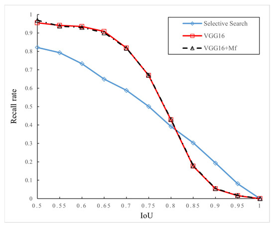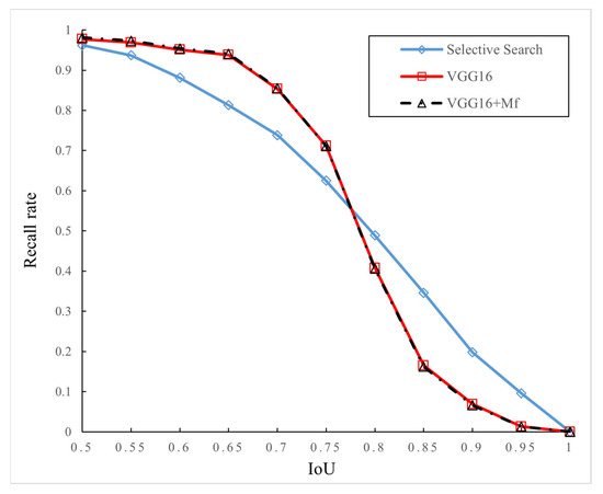 Then, the number of generated region proposals are reduced from 2000 to 300, and other parameters remain unchanged for the second experimental group. The experimental results are shown in Figure 8. It can be seen from the figure that the Selective Search greatly reduces the recall rates due to the reduction in the number of generated region proposals, which also greatly affects the recognition performance. However, the other two models based on the VGG16 network are less affected by the number of generated region proposals. Table 2 records the recall rates when 300 region proposals are generated with IoU values of 0.5, 0.7, and 0.9, respectively. As can be seen from the table, compared with the traditional VGG16 network, the improved model based on the multi-layer feature combination proposed in this paper has a certain degree of improvement in the recall rates, and the improvement amplitude is greater than that in the case of 2000 region proposals.