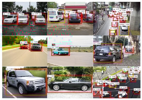 Finally, based on the multi-layer feature combination (M1), we added the contextual features and bounding box optimization to the Faster R-CNN model for experiments (denoted as M2); the results of the vehicle-type recognition tests are shown in Table 6. Compared with the results in Table 4, the mAP of the VGG16 network is increased by 0.73% after adding multi-layer feature combination, contextual features, and object bounding box optimization (compare M2 + VGG16 with O1 + VGG16), and the mAP is increased by 0.16% after contextual feature combination and bounding box optimization (compare M2 + VGG16 with M1 + VGG16). The mAP of the ResNet50 network is increased by 0.98% (compare M2 + ResNet50 with O1 + ResNet50), and the mAP is increased by 0.27% (compare M2 + ResNet50 with M1 + ResNet50). The mAP of the ResNet101 network is increased by 1.72% (compare M2 + ResNet101 with O1 + ResNet101), and the mAP is increased by 1.12% (compare M2 + ResNet101 with M1+ResNet101). Some of the vehicle-type recognition results of the improved Faster R-CNN model are shown in Figure 9. It can be seen from the figure that the improved model proposed in this paper based on Faster R-CNN can better identify the vehicle types in images of actual complex traffic.