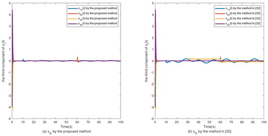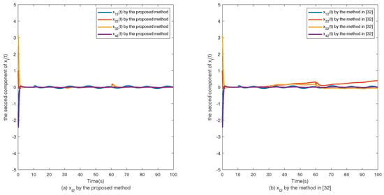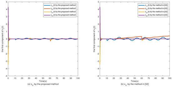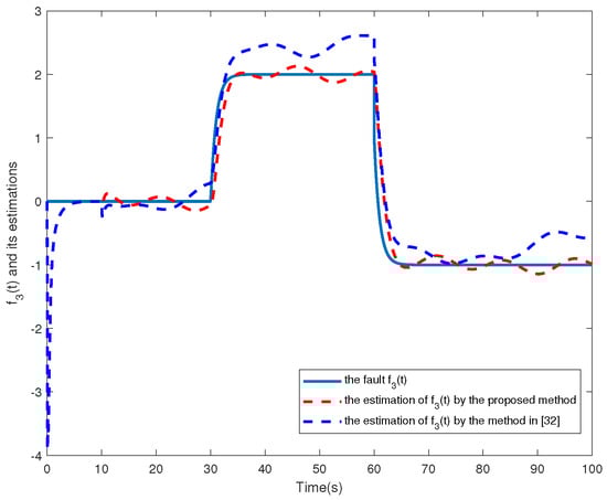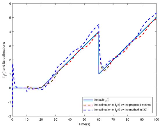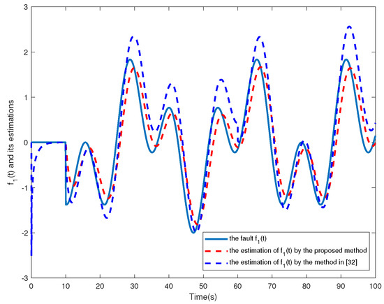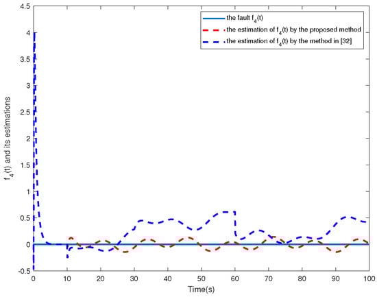 The simulation results are shown in Figure 2, Figure 3, Figure 4, Figure 5, Figure 6, Figure 7 and Figure 8. Figure 2, Figure 3, Figure 4 and Figure 5 show the effectiveness of fault estimation for the actuators of the four agents, respectively, where the red dashed line represents the result of the proposed method and the blue dashed line represents the result of the method proposed in [32]. As can be seen in Figure 2, Figure 3, Figure 4 and Figure 5, the fault estimation results of all agents are more satisfactory. Figure 6, Figure 7 and Figure 8 validate the efficacy of the fault-tolerant control protocol presented in this paper, and the results are better than those of the method proposed in [32]. Obviously, the state component of each agent converges to a small enough range under the designed fault-tolerant control protocol, and the influence of the actuator fault on the convergence process is greatly reduced. In addition, it is found that the fault estimation matching condition of fault estimation is not satisfied, and the bounds of the fault and its derivatives are not required. Therefore, the distributed fault estimation method based on the intermediate variable observer and the fault-tolerant control protocol based on fault estimation proposed in this paper are validated on a MAS with uncertainty.