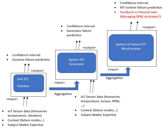 The key advantage to distributing DT is classifying a smart manufacturing system into unit, system, or systems of systems [6,21], or, similarly, it is usually labeled as local, system, and global DTs [36]. This framework is designed to accommodate the need for data collection from lower levels (sub-components of the manufacturing systems) and pre-processing and processing of all data from a component or production line, and the overall manufacturing system/shop floor is modeled in the global DT. Different approaches to the deployment of DT are usually adopted depending on the requirements of the system. In the methodology described by [6] and extended in Figure 2, for the context of PdM, the relationship between the three layers of DT can be summarized as shown in Figure 2.