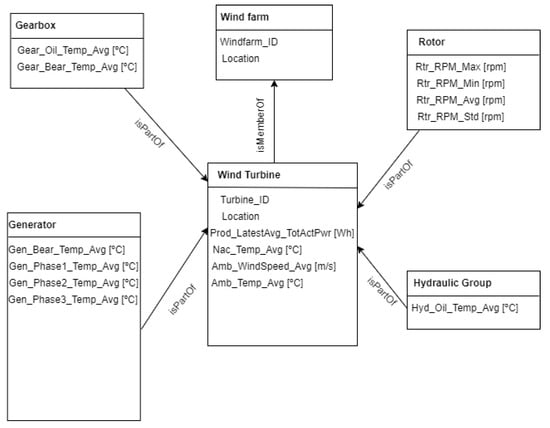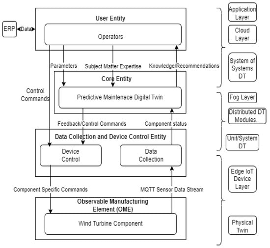 Figure 5 describes a mapping of the ISO 23247 reference architecture [8,32] to the presented case study of a wind turbine’s predictive maintenance distributed DT and how it links to the layers of the framework. This is an excerpt that guides the proposed framework in this study from the more detailed functional view of the ISO 23247 reference model for manufacturing.