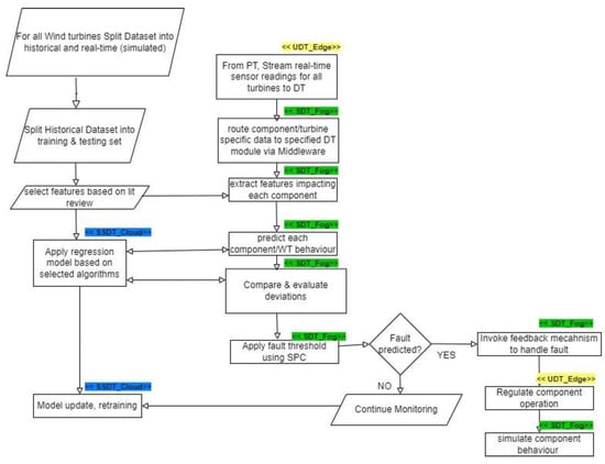 In terms of using the distributed DT concept to improve prognostics in PdM applications, it is ideal to design a framework that considers the hardware and software requirements, standards, and prediction feedback loop [4,19]. The solution architecture introduced in [19] is leveraged in this work to achieve the results of improving prognostics of wind turbines.