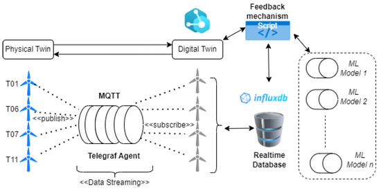 The authors in [14] developed a predictive digital twin for offshore wind turbines in which they used the prophet algorithm as a time series prediction model. The DT in [14] was developed in Unity3D to have a visual sense of the operating conditions of the wind turbines using the OPC-Unified Architecture (OPC-UA) as the data communications protocol that streams live data to the DT. Ref. [14] used vibration and temperature data for their model and the choice of prophet model was to factor in seasonality. The root mean square (RMS) achieved showed they were able to predict failure before it occurred. The authors of [14] suggested the DT feedback was based on the ability of a user to forecast future failure from the DT. The implemented DT in this work, our framework, supports an “intelligent DT” that enhances two-way feedback.