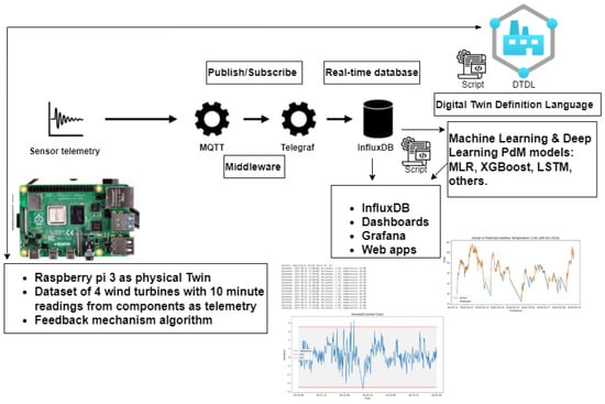 This work presented a framework that supports the implementation of a distributed digital twin capable of improving PHM in an IIoT-enabled manufacturing setting such as wind turbines. From the architectural framework, methodology, and results, it is evident that this presented DT framework can also help both in real-life PHM solutions as well as in experimentation. In the framework, different components’ operational readings were collected in real time using sensors simulation, then, based on historical and real-time data from the DT, different machine learning techniques were applied to predict potential issues and failure of a component. In terms of the versatility of the architecture, it supported, for example, which algorithm was more suitable for which component, as well as which model was best in handling seasonality.