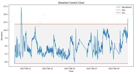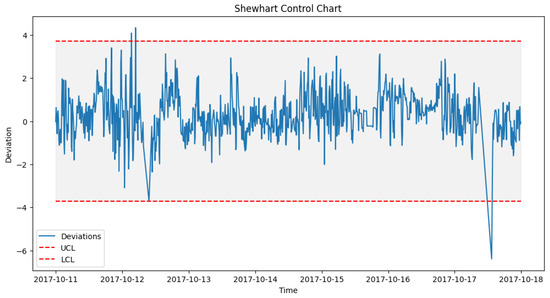 To achieve the prediction feedback loop, the DT module handling each component must triage the deviations from the moment of failure prediction and perform some predictive modeling on them. In our case study, from the EDP [43] dataset, taking turbine T06 2017_Gearbox as an example, the prediction shown in Figure 14 was on the 12th of October 2017 08:38. However, actual deviations that indicated a potential issue with the gearbox started occurring two weeks before the failure, on 5th of October 2017 at 12:07. Figure 16, Figure 17 and Figure 18 show the behavior of the gearbox temperature in a weekly snapshot up to 1 month before failure. It can be observed that within this 1 month before failure, the first two weeks (20 September to 4 October 2017) appear to be normal, with their SPC within the acceptable range, while the second two weeks (4 October to 18 October 2017) show the deviations that predicted failure.
