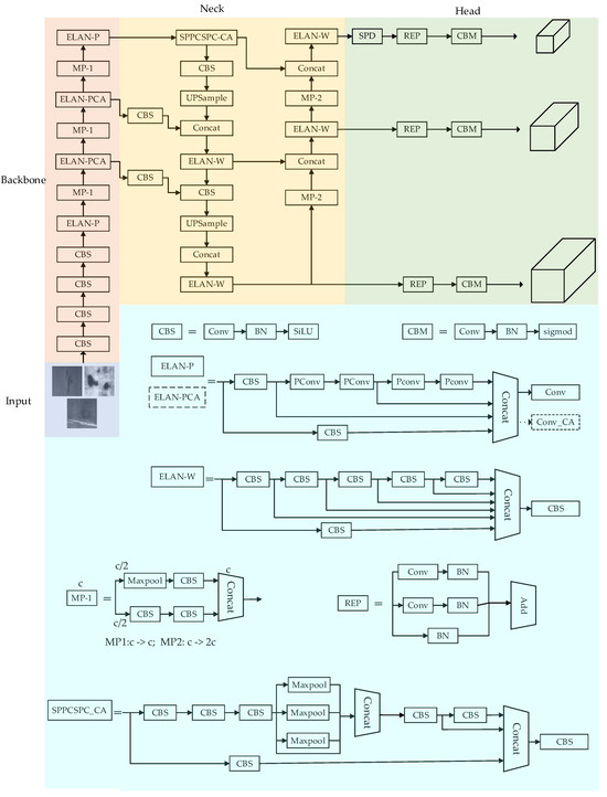 This article addresses the problem of insufficient feature extraction ability and low model detection accuracy in current surface defect detection algorithms for steel strips. Based on the YOLOv7 series, the YOLOv7 algorithm is improved to improve the efficiency of steel surface defect detection. Firstly, a lightweight Partial Conv (PConv) [25] is used to replace some conventional convolutional blocks in the backbone network ELAN module, in order to reduce the size of the network model and improve the detection speed; Secondly, a Coordinate Attention (CA) [26] mechanism is added to the last convolution layer of the middle two ELAN modules to enhance the network’s ability to extract image features and improve the effectiveness of object detection in complex environments; Finally, an SPD convolution module [27] is introduced at the output end to improve the detection performance of small targets with surface defects on steel. The specific structure is shown in Figure 1. The improved YOLOv7 algorithm proposed in this article was tested on the NEU-DET dataset, and the experiments showed that the method has good detection performance in surface defect detection tasks of strip steel, which can further meet industrial deployment requirements.