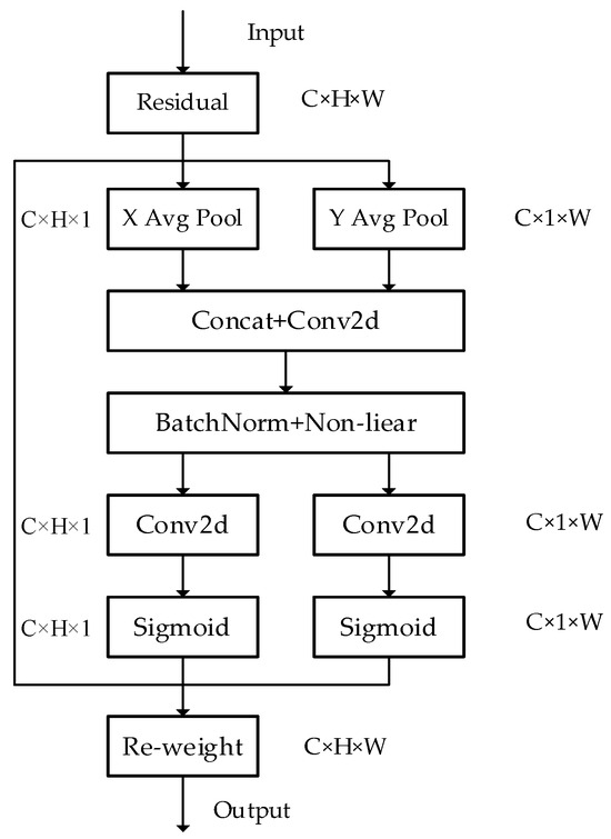 [] represents cascading operations along spatial dimensions, is a non-linear activation function, where is an intermediate feature map that encodes spatial information in both horizontal and vertical directions. To reduce the complexity of the model, an appropriate reduction ratio is usually used to reduce the number of channels in . Then, we split f into two independent tensors, and along the spatial dimension. The other two 1 × 1 convolutional transformations, and , are used to transform and into tensors with the same number of channels as input X, respectively, to obtain: