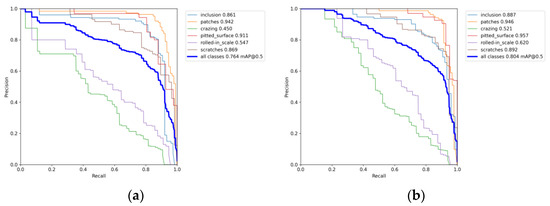 From the above data comparison, it can be seen that the improved YOLOv7 algorithm’s mAP value has increased from 76.4% to 80.4%, an increase of 4.0 percentage points. The AP value of Cr defects increased by 7.1 percentage points from 45.0% to 52.1%; The AP value of In defects increased by 2.6 percentage points from 86.1% to 88.7%; The AP value of the Pa defect increased by 0.4 percentage points from 94.2% to 94.6%; The AP value of the Ps defects increased by 4.6 percentage points from 91.1% to 95.7%; The AP value of the Rs defects increased by 7.3 percentage points from 54.7% to 62.0%; The AP value of the Sc defects increased by 2.3 percentage points from 86.9% to 89.2%, and the AP values detected for all six types of defects improved.