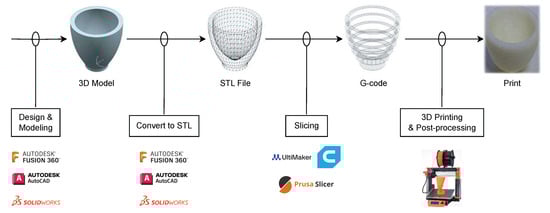 Additive manufacturing (AM), commonly known as 3D printing, has revolutionized the way objects are created, from simple models to complex structures used in various industries. The process involves adding material layer by layer to create objects from 3D model data, contrary to traditional subtractive manufacturing methods. The overall pipeline of AM encompasses several critical steps, each contributing to the final product’s accuracy, quality, and functionality. Each step in the AM pipeline is vital for ensuring that the final product meets the desired specifications and quality standards. Advances in software, materials, and printing technologies continue to expand the possibilities of what can be achieved with 3D printing, making it an increasingly integral part of modern manufacturing processes Figure 2. The overall workflow of the additive manufacturing process is given below.