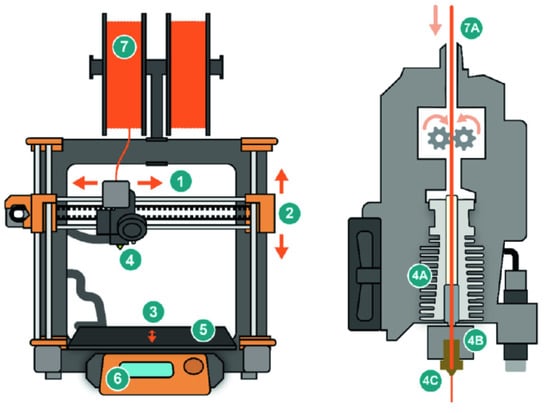 Schematic diagram of FDM 3D printing technology []. The picture on the left shows the whole structure of typical FDM printers where parts (1) to (7) are x-axis motor, z-axis motor, y-axis motor, hot nozzle, printing bad, controller display board, and filaments, respectively. The picture on the right shows more details of the printing nozzle where (7A) is the feed filament, and (4A), (4B), and (4C) are heating wires, Hotend, and extruded materials, respectively.