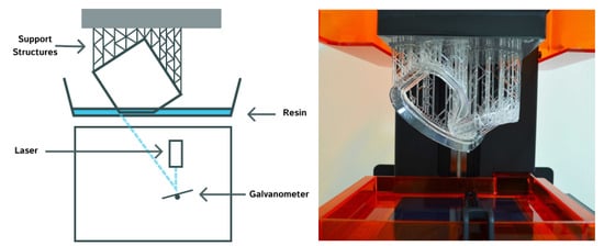 Generally, the VAT polymerization (VP) technique uses a light source to cure a photopolymer resin contained within a reservoir []. There are three types of VP—stereolithography, digital light processing, and continuous digital light processing.