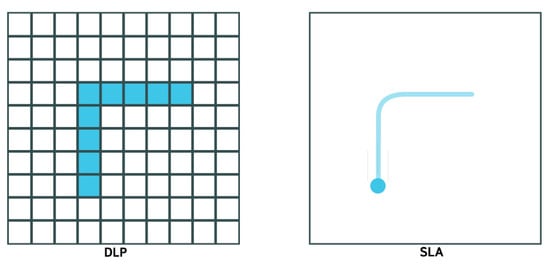 Of these three forms of VP, stereolithography (SLA) is distinct from the two similar techniques of regular DLP and continuous DLP (cDLP). Therefore, SLA will be discussed first, followed by both DLPs. Stereolithography utilizes a laser to cure a photopolymer resin onto a build plate in the desired geometry. The laser traces the resin within the reservoir as required per the guidance of a mirror. SLA printers are either top-down or bottom-up oriented. For top-down printers, the build plate starts at the top of the reservoir, the laser cures the layer as specified by the geometry code, and then the build plate moves down corresponding to one increment of layer thickness; thus, each successive layer is above the previous. On the other hand, the build plate of bottom-up printers starts at the bottom of the resin reservoir. Between each curing, the build plate moves up one thickness layer, resulting in each successive layer being below the prior []. Parameters that influence which printer orientation is used to print an object includes product size and complexity, time, reliability, etc. Digital light processing is similar to SLA in that a photopolymer resin is being cured; however, this method utilizes a digital light projector for curing. This digital light projector cures the complete layer simultaneously rather than tracing. Because the curer is a digital source, the print will exhibit square-like subunits composing each layer; these are square light pixels called “voxels” []. Despite these differences, DLP printers can also be oriented top-down or bottom-up with the same operation. The distinction between DLP and cDLP is the movement of the build plate along the z-axis. For DLP, the build plate moves one layer thickness per cure, while the cDLP build plate continuously moves along the z-axis to accommodate continuous curing, which results in shorter build times []. Figure 4 shows the schematic of the SLA 3D printing process and a print sample. Note that a schematic for cDLP is not included because the difference in build plate motion is not visible in an image. Furthermore, two images are provided for SLA to display top-down versus bottom-up printer orientation, but this is applicable to DLP as well. Figure 5 shows the different lighting technologies between SLA and DLP. The can be seen that a laser cures the resin by tracing a path in SLA while a voxel grid is illuminated to cure resin a full layer at a time.