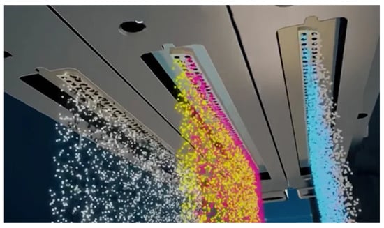 Material Jetting (MJ) operates akin to a two-dimensional inkjet printer, but instead of ink, it sprays material onto the construction platform using either a continuous or DOD approach. An illustration of how the Stratasys J55 (Stratasys, Ltd., Eden Prairie, MN, USA; Rehovot, Israel) dispenses print material is shown in Figure 6 []. The process involves layer-by-layer construction as the material solidifies upon the substrate, and the print head, equipped with nozzles, moves horizontally across the build platform. The complexity of these machines varies, affecting the deposition methods and the materials used. The limited material options include polymers and waxes due to their viscosity and suitability for forming droplets.