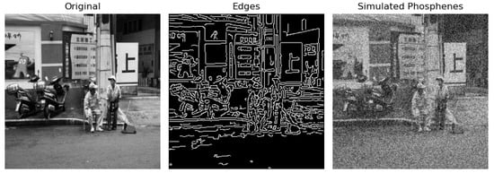 The edge detection [18] and simulated phosphene [35] of an image is shown in Figure 2. The edges do not provide a clearer view due to the presence of irrelevant objects and background information. This result leads to difficulty in the identification of objects in vision. On the right side, the simulated phosphene is shown, where it can be analyzed that the objects are not easily identified as well, thus urging the need to further enhance the vision such that multiple objects can be easily identified. This will enable systems like an artificial retina to address the challenges of representing real-world objects in a better way, with its current limitations imposed by its hardware.