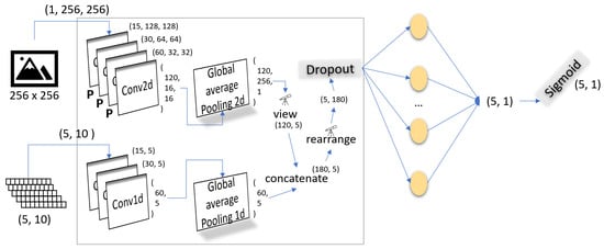 Since the dataset preparation part is complete, the model’s network is designed in such a way that its performance is not adversely affected. Inspired by CNN architecture [54,55], the first part of the model applies four 2D convolutions to the image and four 1D convolutions to the object detail matrix to extract initial features. Then, global 2D and 1D average pooling is applied to each branch, respectively. Both the initial features of the image and object details are rearranged and concatenated, followed by a dropout method. The earlier process gives us initial features combined together from the image and objects, which are fed to the linear layer. This gives us an output in the form of five binary outputs that refer to the primariness of each object.