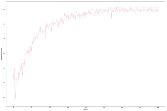 Figure 9 represents the validation accuracy during the epochs. It is evident from the incline in the line graph that the accuracy is increasing as the epochs proceed, which reflects a fair enough accuracy, i.e., 86.2%. During the calculation of accuracy, the top five objects are considered to reflect a fair analysis for each object of the image. Detailed accuracy results for top ‘n’ objects are provided in later sections. It can be concluded from this result that the training along with the validation accuracy show a fair enough result, and hence, the proposed model can be considered a good candidate for this specific classification problem when considering a higher accuracy for all objects.