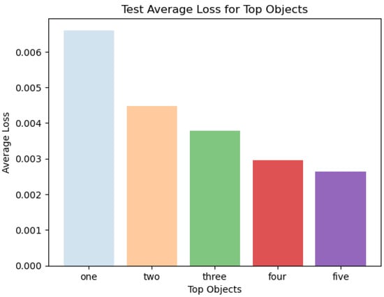 Figure 10 represents the average losses over the test data. The sky-blue, peach, green, red, and purple colors refer to the top one, two, three, four, and five objects. It can be depicted from the loss values that the top five objects’ results have the least value. The loss values for the top one, two, three, four, and five objects are 0.0062, 0.0045, 0.00385, 0.003, and 0.00257, respectively. Based on the loss values, it can be concluded that the loss values are low enough to refer to the fact that the proposed model can be stated as a good candidate for this specific classification problem. With this said, the top ‘n’ object analysis refers to a fair comparison of average losses.