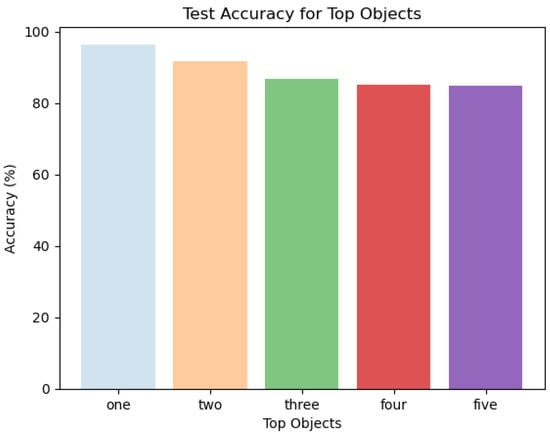 Figure 11 represents the average accuracy over the test data. It is evident that the accuracy decreases as the TP ‘n’ objects increases but the difference is negligible and, thus, provides a fair enough accuracy for the classification problem, i.e., 84.8%. The accuracies for the top one, two, three, four, and five objects are 96.4%, 91.8%, 86.8%, 85.2%, and 84.8%, respectively. This result refers to the fact that the proposed model is a reliable candidate for classifying the top five objects because it guarantees a higher accuracy. With this said, it can be concluded that the proposed model makes a fair analysis over the top ‘n’ objects with a higher accuracy and, hence, is a good candidate model for this specific classification problem.