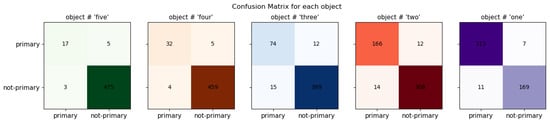 In Figure 12, the confusion matrix is depicted, which refers to the confusions made in the classification of the primary and non-primary objects of the image. The green, brown, blue, orange, and purple colors represent the fifth, fourth, third, second, and first object details. Each colored box is called a confusion matrix that represents each object. Each of the confusion matrices contain the TP, false positives (FP), false negatives (FN), and true negatives (TN), which are placed in each confusion matrix’s top-left, top-right, bottom-left, and bottom-right boxes, respectively. Against each confusion matrix, which represents each object’s statistics, it is evident that there are higher values of TP and TN as compared to the FP and FN, which refer to the fact that the accuracy is high for each object separately. In parallel, the lower values of FP and FN refer to the low error in the classifications made. Hence, the proposed model can be considered a good candidate for this specific classification problem.