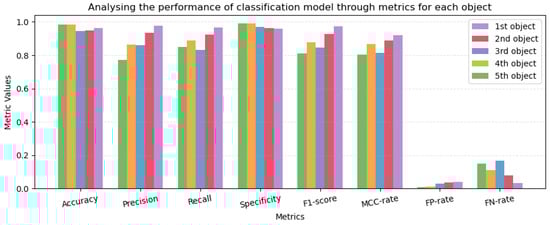 Figure 13 depicts the accuracy, precision, recall, specificity, f1-score, Matthews correlation coefficient (MCC) rate, FP rate, and FN rate for all objects separately. Each comparison is for the top ‘n’ (five, four, three, two, and one) object(s), respectively.